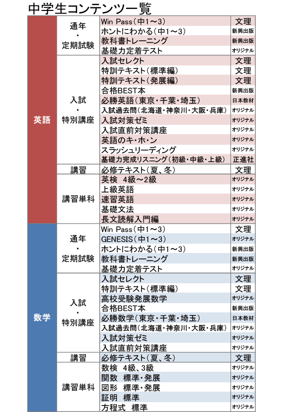 どんどん予習をして力をつけたい人には「Winpass」、定期テストで点数を取りたい人は「教科書トレーニング」、弱点を克服したい人は「Assist-Genesis」「ほんとにわかるシリーズ」と目的に合わせたコンテンツを選ぶことができます。