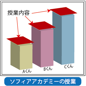 クラス分けされていても、クラス内の個々の理解力や問題を解くスピードはAくん、Bくん、Cくんのように違いますが教える進度、内容は一緒になります。ソフィアアカデミーでは、一人ひとりに適切な進度や負荷を考えたカリキュラムで学習できます。